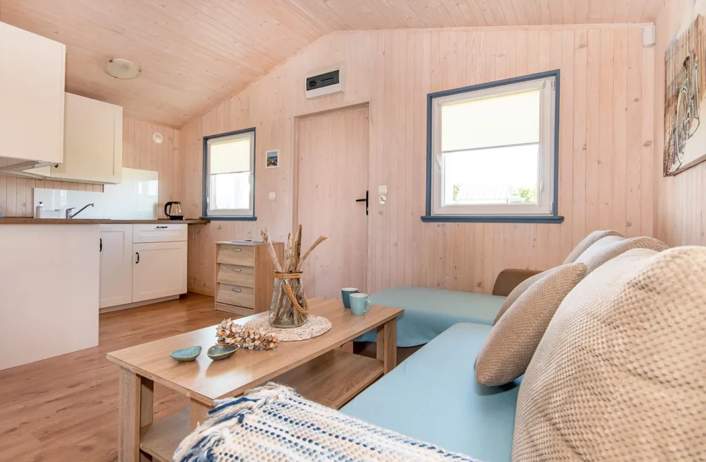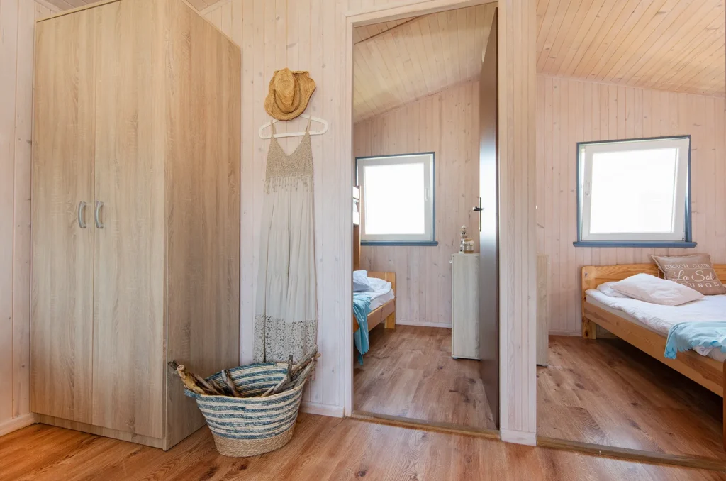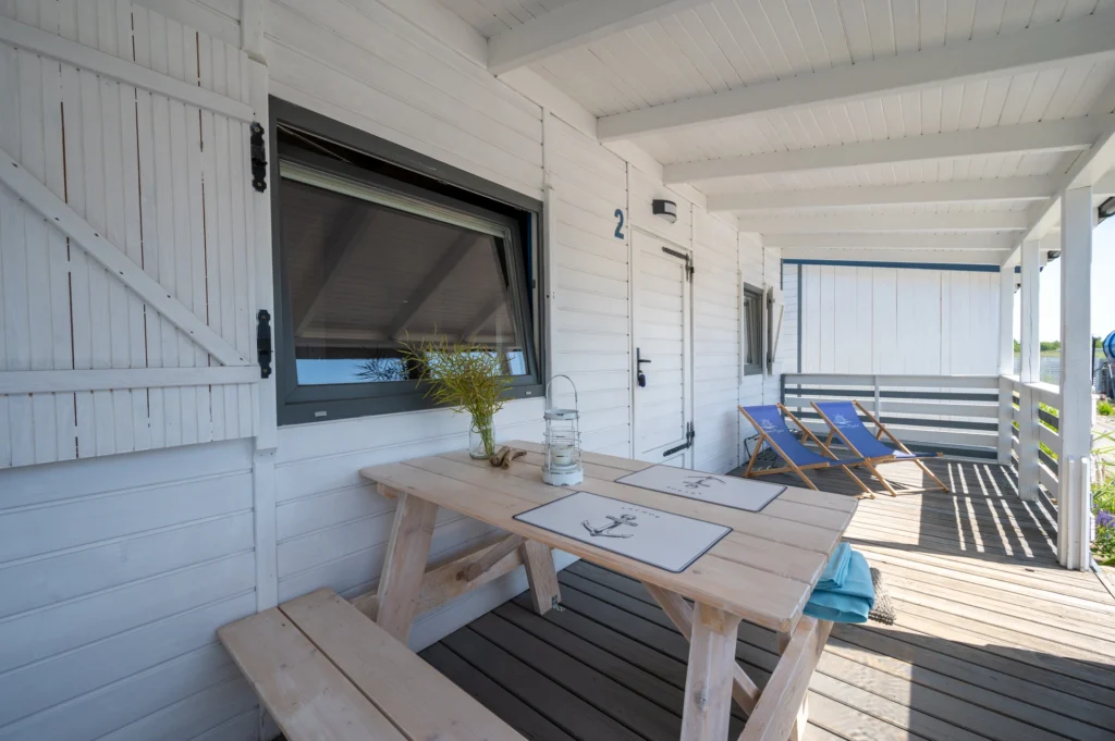 - Taras 14m2 wraz z ławostołem, sprzęt plażowy (parawan, leżaki) – tarasy są również wyposażone w plandeki ochraniające od deszczu i wiatru