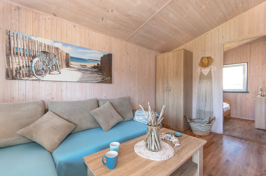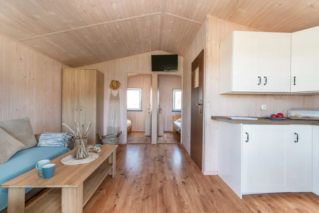 - salon (rozkładany narożnik – możliwość spania dla 2 osób, stolik, szafa, szafka na buty, wieszak, TV 32″, 2 krzesła),