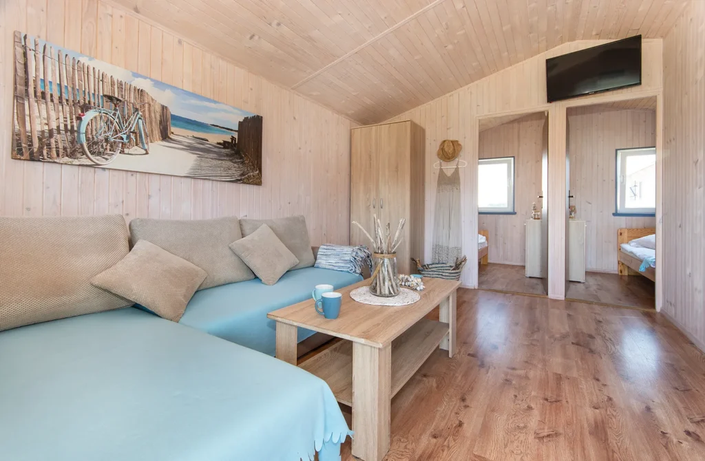 - Taras 10m2 wraz z ławostołem, sprzęt plażowy (parawan, leżaki)- tarasy są również wyposażone w plandeki ochraniające od deszczu i wiatru